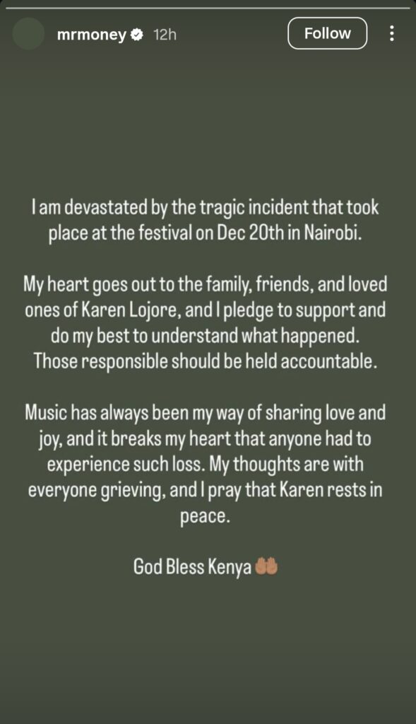 « Je suis dévasté par le tragique incident qui s’est produit lors du festival le 20 décembre à Nairobi. Mes pensées vont à la famille, aux amis et aux proches de Karen Lojore, et je m’engage à les soutenir et à faire tout mon possible pour comprendre ce qui s’est passé. Les responsables doivent répondre de leurs actes. »